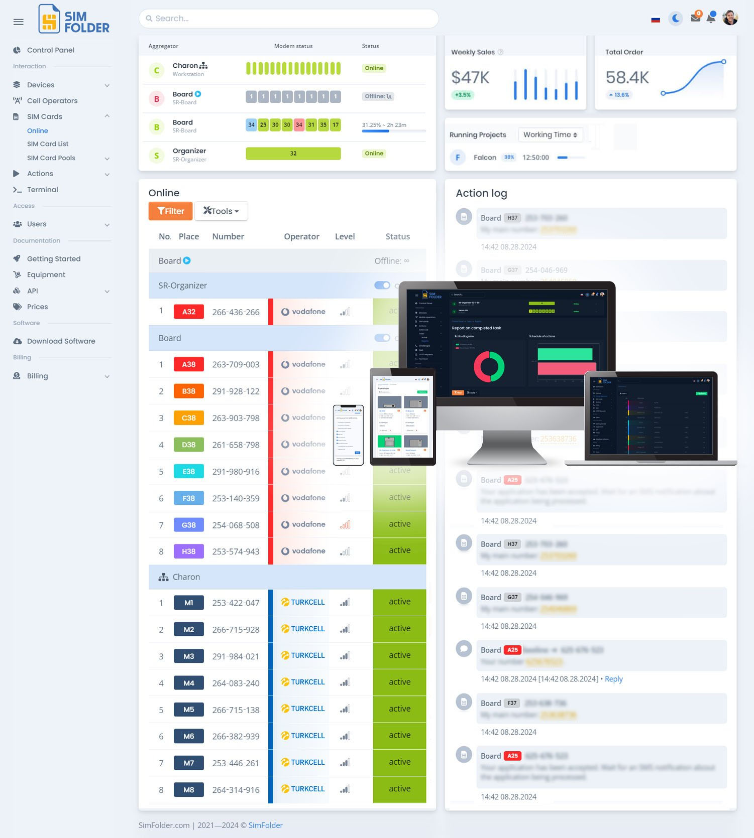 SimFolder makes working with SIM cards simple and efficient, regardless of the type of equipment you use. Just connect a SIM bank, SIM box, SIM aggregator, GSM gateway, or smartphone to the system, and SimFolder will automatically determine the type of equipment and add it to the unified network of devices in your account. You can manage connected SIM cards via the control panel, API, or messenger. Convenient access rights differentiation allows you to involve your employees and clients in collaborative work.